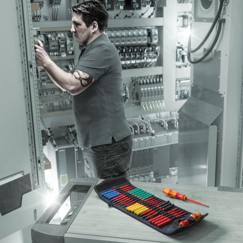 Набір діелектричного інструменту Wera Kraftform Kompakt VDE 17 Extra Slim 1 (05006617001) включає 26 предметів для безпечної роботи під напругою до 1000 В. Комплект складається з двох багатокомпонентних ручок-тримачів 817 VDE та певного асортименту змінних робочих насадок з тонким робочим кінцем (Extra Slim) для доступу до глибоко розташованих гвинтів та пружинних елементів.