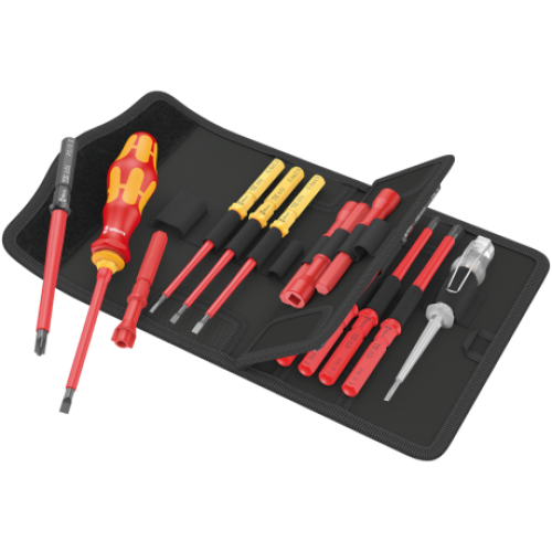 Комплектація набору: викрутка-тримач Wera 817 VDE 1 x 102мм, індикатор напруги Wera 247 1x3.0x70,  1x PH 1x154 мм,1x PH 2x154 мм, 1x PZ 1x154 мм, 1x PZ 2x154 мм, 1x # 1x154 мм (завужений стрижень PH/SL),1x # 2x154 мм (завуженний стрижень PH/SL), 1x # 1x154 мм (завуженний стрижень PZ/SL), 1x # 2x154 мм (завуженний стрижень PZ/SL), насадка торцева Wera KK 96 VK 6.3, насадка торцева Wera KK 97 VK 8.1, насадка торцева Wera KK 98 DK, насадка торцева Wera KK 99 FL, 1x SL2.5 x154 мм, 1x SL3.5 x154 мм, 1x SL4 x154 мм, 1x SL5.5 x154 мм, нейлонова сумка.
