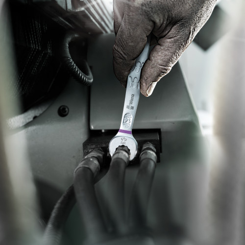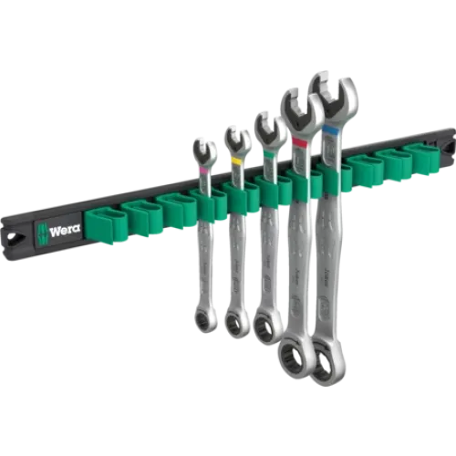Набір ключів Wera 9631 Magnetic Rail 6000 Joker 2 включає 11 комбінованих ключів із тріскачковим механізмом розміром від 8 до 19 мм. Інструменти зафіксовані на магнітній планці, яка забезпечує хороше кріплення до металевих поверхонь, таких як інструментальні візки або стінки стелажів. Планка оснащена поворотним механізмом "Unlock", що дозволяє легко витягати ключі.