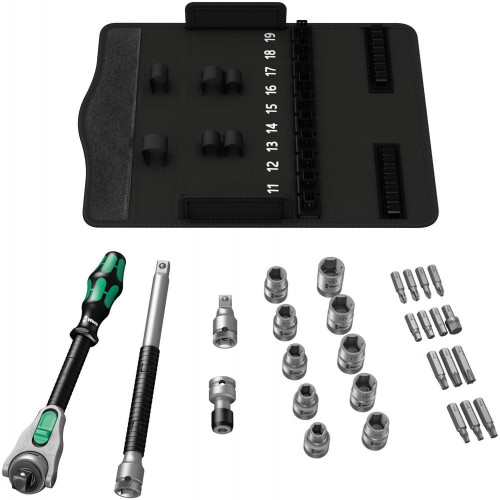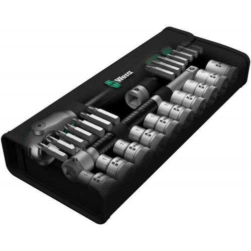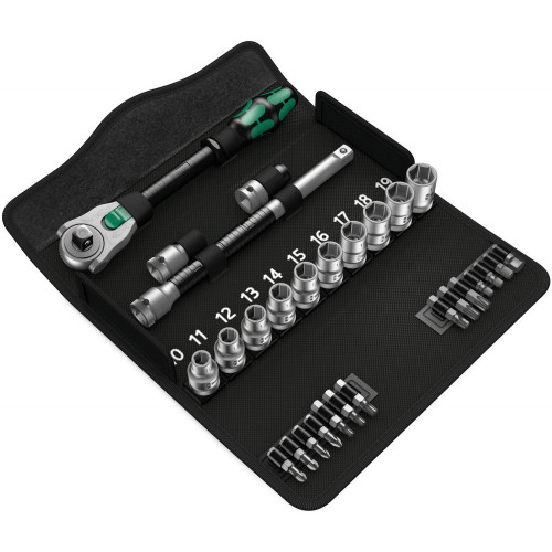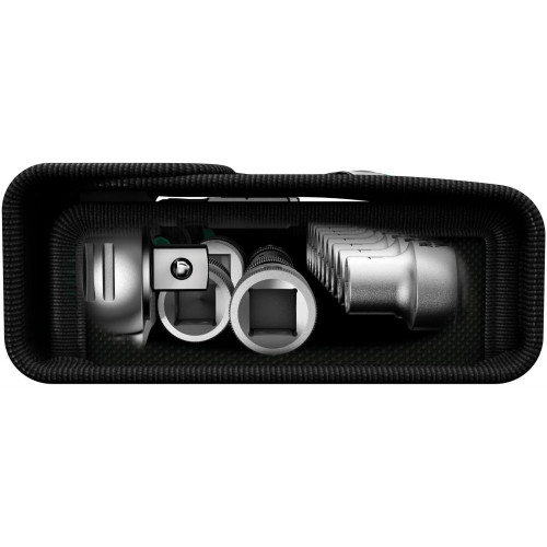 До складу набору входять торцеві головки Wera Zyklop з кодуванням кольором "Take it easy" для швидкого вибору потрібного розміру. Також комплект містить подовжувач Flexible-Lock із системою блокування, подовжувач Wobble для роботи під кутом та перехідник під біти. Інструменти розміщені в текстильному футлярі, який займає мінімум місця в сумці для інструментів та захищає поверхні від подряпин.
