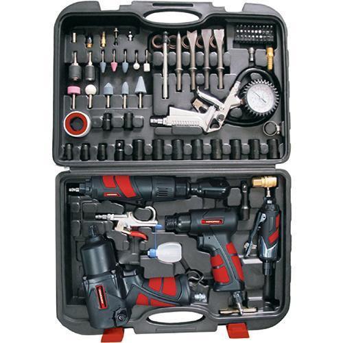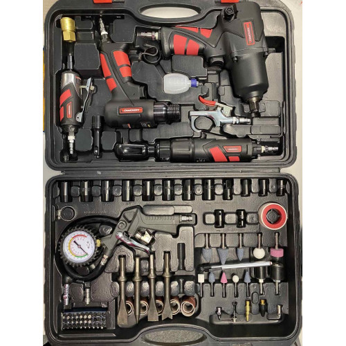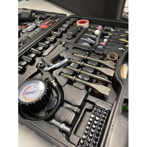 Кожен інструмент у наборі виготовлений із металевих сплавів, стійких до механічних навантажень та технічних рідин. До комплекту входять ударні головки, зубила, шліфувальні камені та перехідники, що робить набір необхідним для професійних майстерень та домашніх гаражів. Весь інструмент та оснащення розміщені у пластиковому кейсі для зручного зберігання та транспортування.