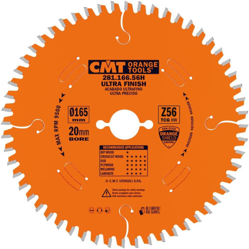 Пиляльний диск CMT 165x20x56z (281.166.56H) призначений для чистового розпилювання ламінованих плитних матеріалів, таких як ЛДСП, МДФ, ДСП та фанера. Зовнішній діаметр становить 165 мм, посадковий отвір — 20 мм.