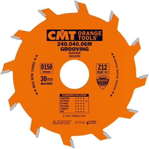 Пазовий пиляльний диск CMT 150x30x12Z (арт. 240.040.06M) призначений для виконання точних пазів та чвертей у деревині та деревних матеріалах. Виріб має зовнішній діаметр 150 мм, посадковий отвір 30 мм та 12 зубів форми FLAT (прямий зуба), що забезпечує отримання чистого дна пазу. Ширина пропилу (керф) становить 4,0 мм, товщина корпусу диска — 3,0 мм.
