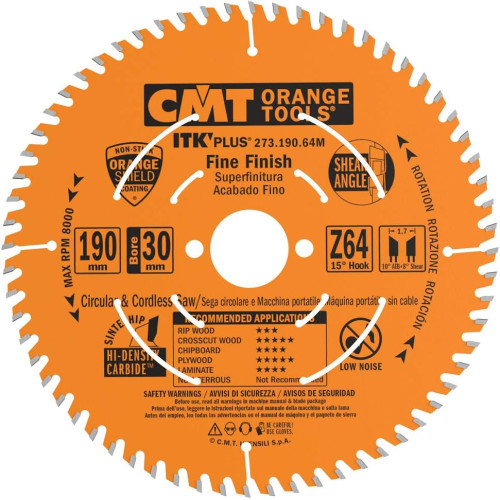 Пиляльний диск CMT 273.190.64M серії ITK Plus діаметром 190 мм з посадковим отвором 30 мм та 64 зубами призначений для фінішного чистового розпилу деревини, фанери та МДФ. Завдяки пропилу 1.7 мм та корпусу товщиною 1.1 мм, диск створює мінімальний опір при різанні, що дозволяє подовжувати термін служби двигуна інструменту.