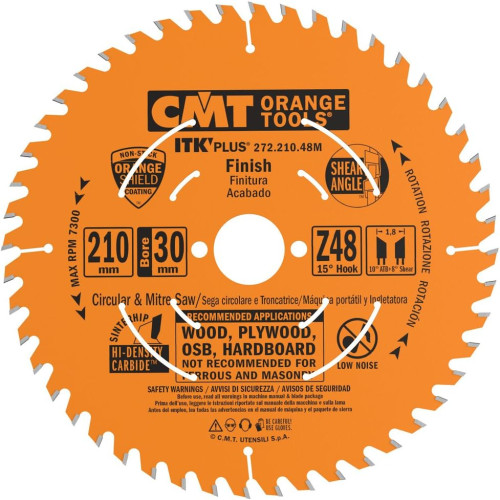 Пиляльний диск CMT 210x30x48z (арт. 272.210.48M) серії ITK Plus розроблений для чистового поперечного розпилу м'якої та твердої деревини, фанери та OSB. Тонкий пропил 1,8 мм зменшує опір при різанні, що знижує навантаження на двигун інструмента та мінімізує кількість відходів матеріалу.