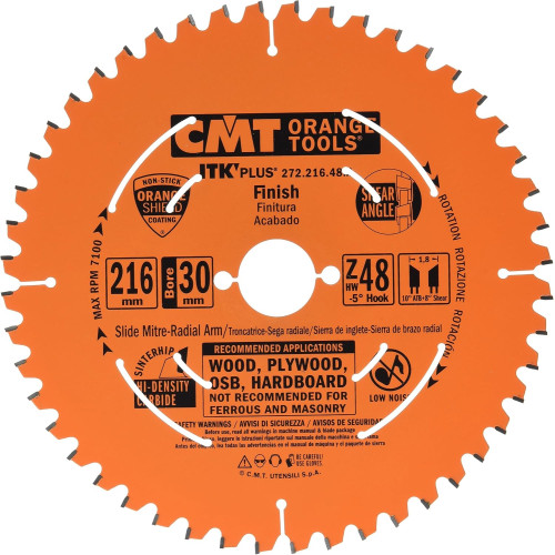 Пиляльний диск CMT серії ITK Plus (артикул 272.216.48M) розроблений для чистового поперечного розпилювання м'якої та твердої деревини, фанери, деревопохідних матеріалів. Зовнішній діаметр диска становить 216 мм, посадковий отвір — 30 мм.