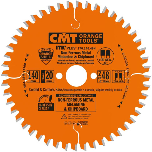 Пильний диск CMT 276.140.48H діаметром 140 мм із посадковим отвором 20 мм призначений для чистового розпилювання алюмінію, кольорових металів, пластику та ламінованих матеріалів. Завдяки формі зубів TCG (трапеція-плашка) та негативному куту атаки -5°, оснащення забезпечує відповідний контроль над процесом різання та запобігає затягуванню матеріалу під диск.