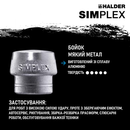 Молоток Halder SIMPLEX 3749.040 оснащений двома змінними насадками з термостійкого алюмінію діаметром 40 мм. Ця модель розроблена для робіт, що потребують значної ударної сили без ризику пошкодження робочих поверхонь іскрами або відкритої деформації. Алюмінієві бойки відрізняються твердістю та стійкістю до високих температур, що робить інструмент придатним для використання в ливарному виробництві, машинобудуванні та при монтажних роботах.